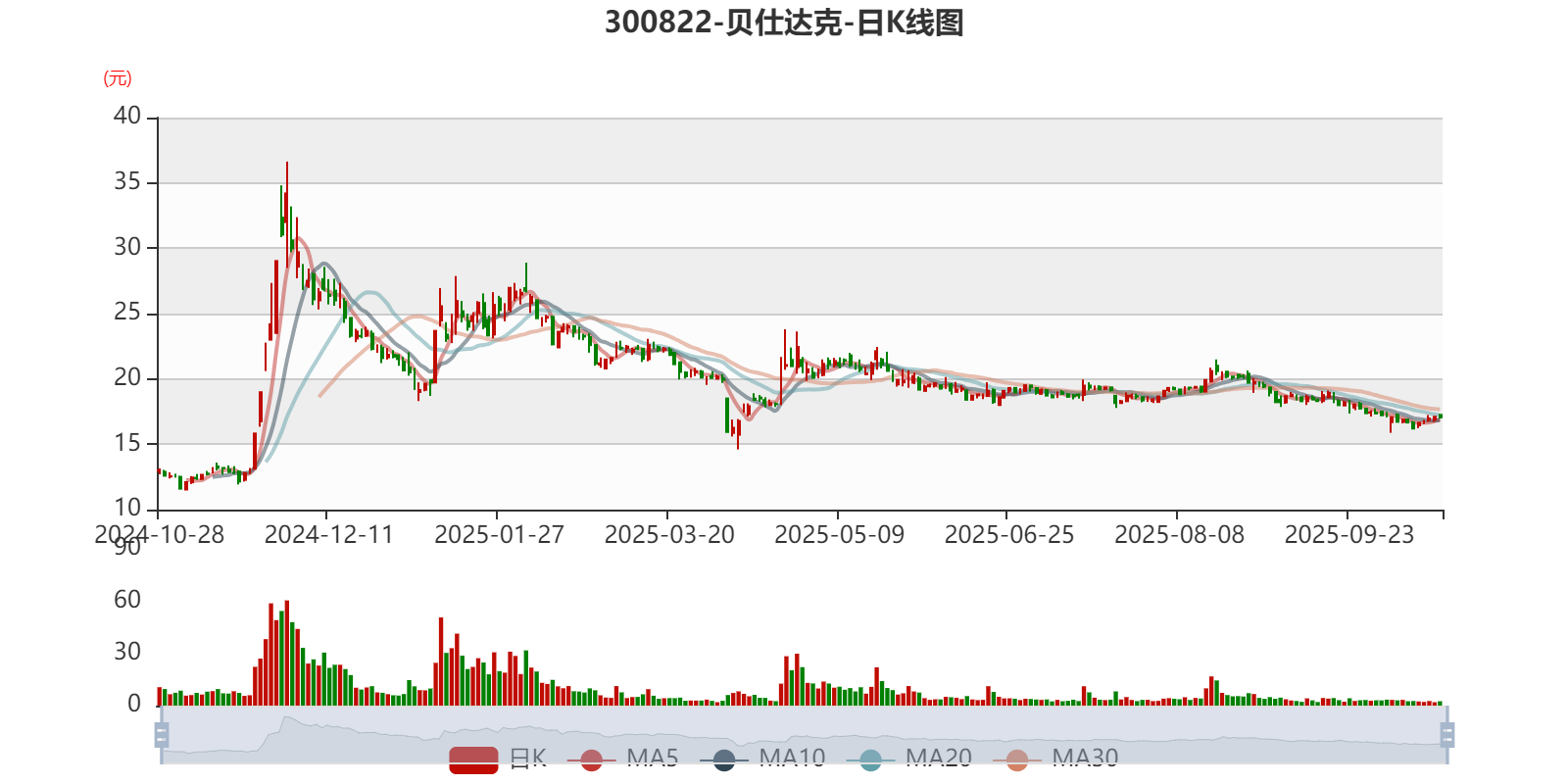 以10月24日收盘价计算,贝仕达克目前市盈率(TTM)约为190.48倍,市净率(LF)约4.22倍,市销率(TTM)约6.24倍。