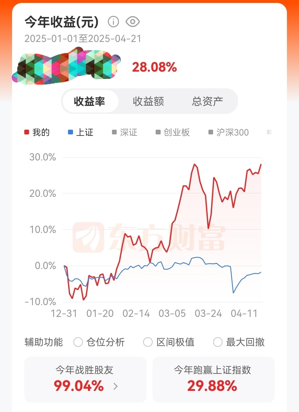 市场波动,我并不怕,稳健是第一位的,我的收益率和收益额比很多股指强,我自己很满意