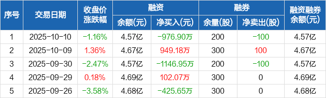 融资方面,当日融资买入716.36万元,融资偿还1693.26万元,融资净偿还976.9万元。融券方面,融券卖出0股,融券偿还100股,融券余量200股,融券余额2214元。融资融券余额合计4.57亿元。