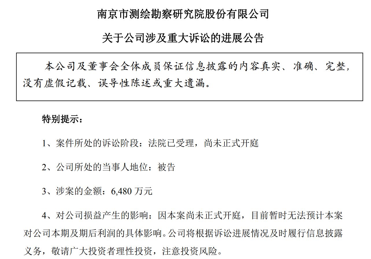 因本案尚未正式开庭,测绘股份在公告中表示,目前暂时无法预计本案对公司本期及期后利润的具体影响。