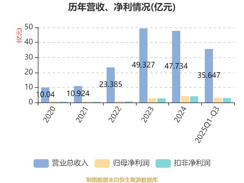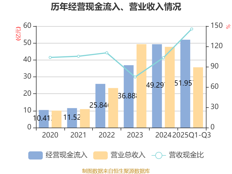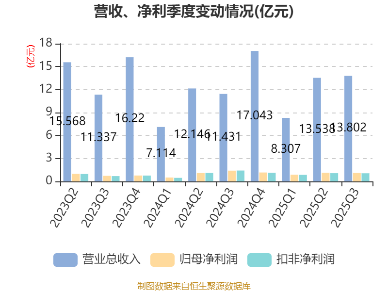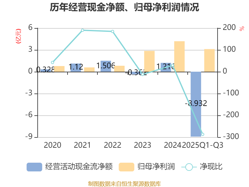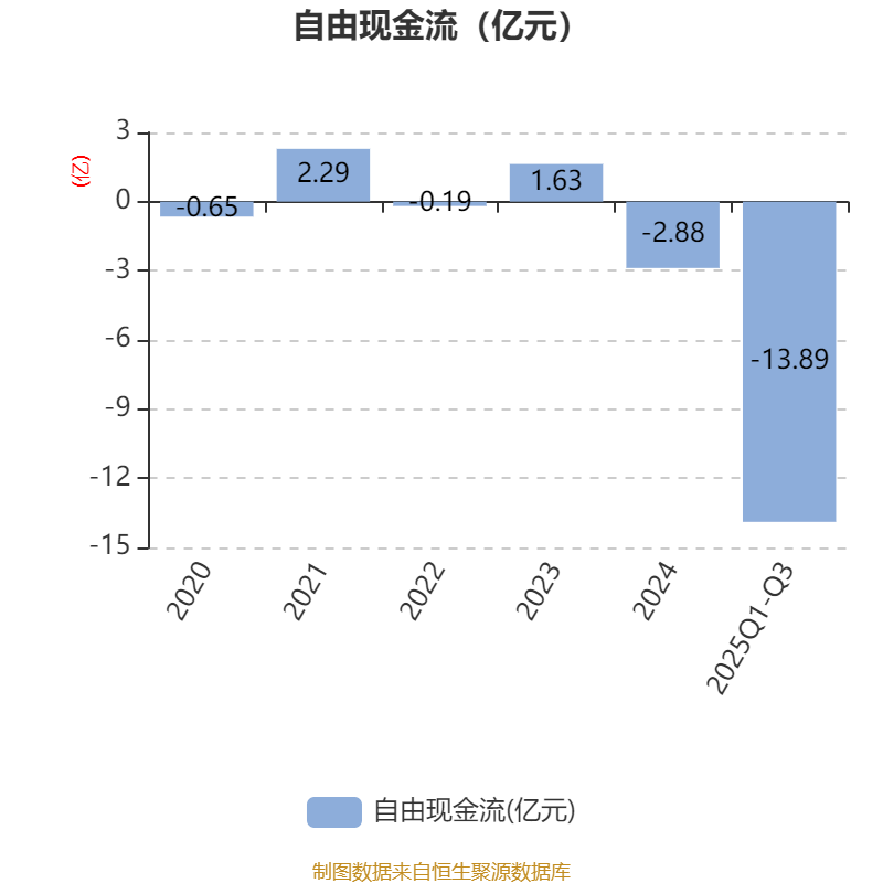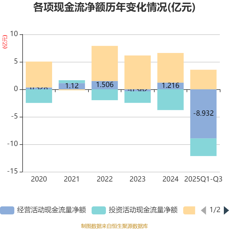 2025年前三季度,公司经营活动现金流净额为-8.93亿元,同比减少2.44亿元;筹资活动现金流净额3.56亿元,同比减少3.66亿元;投资活动现金流净额-3.21亿元,上年同期为-2.93亿元。