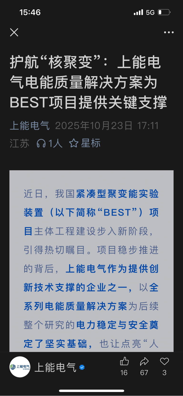 $上能电气(SZ300827)$ 上能电气掌握可控核聚变核心技术