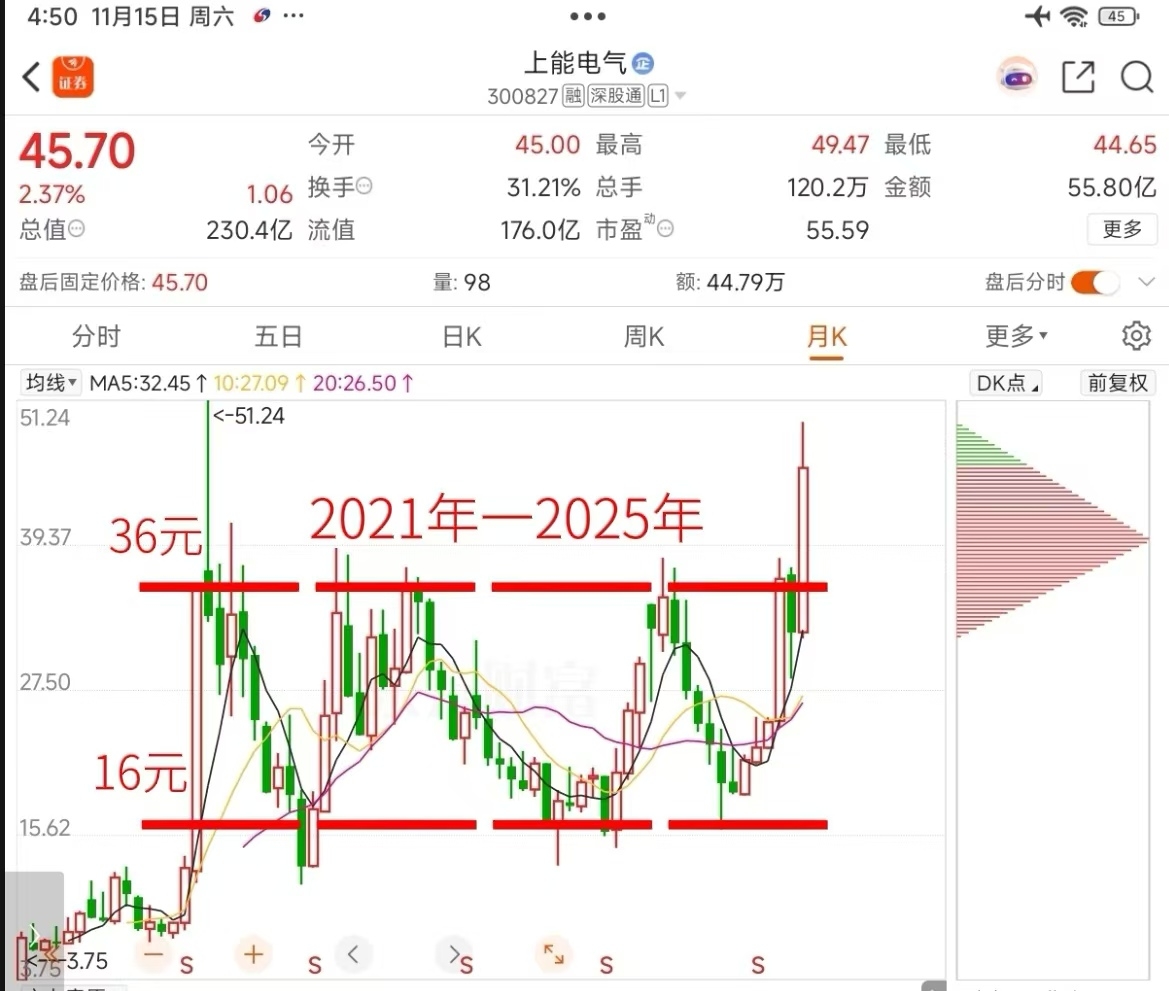 上能电气月K线从20021年—2025年在箱体(低点16元高点36元)运行5年,