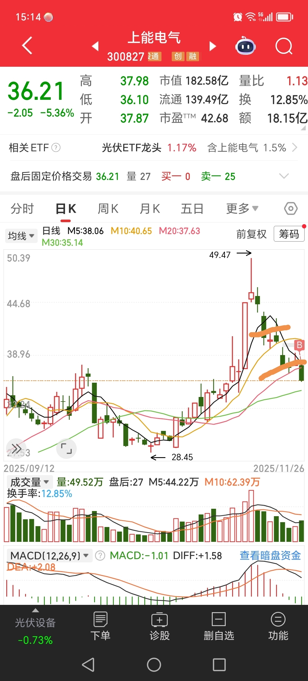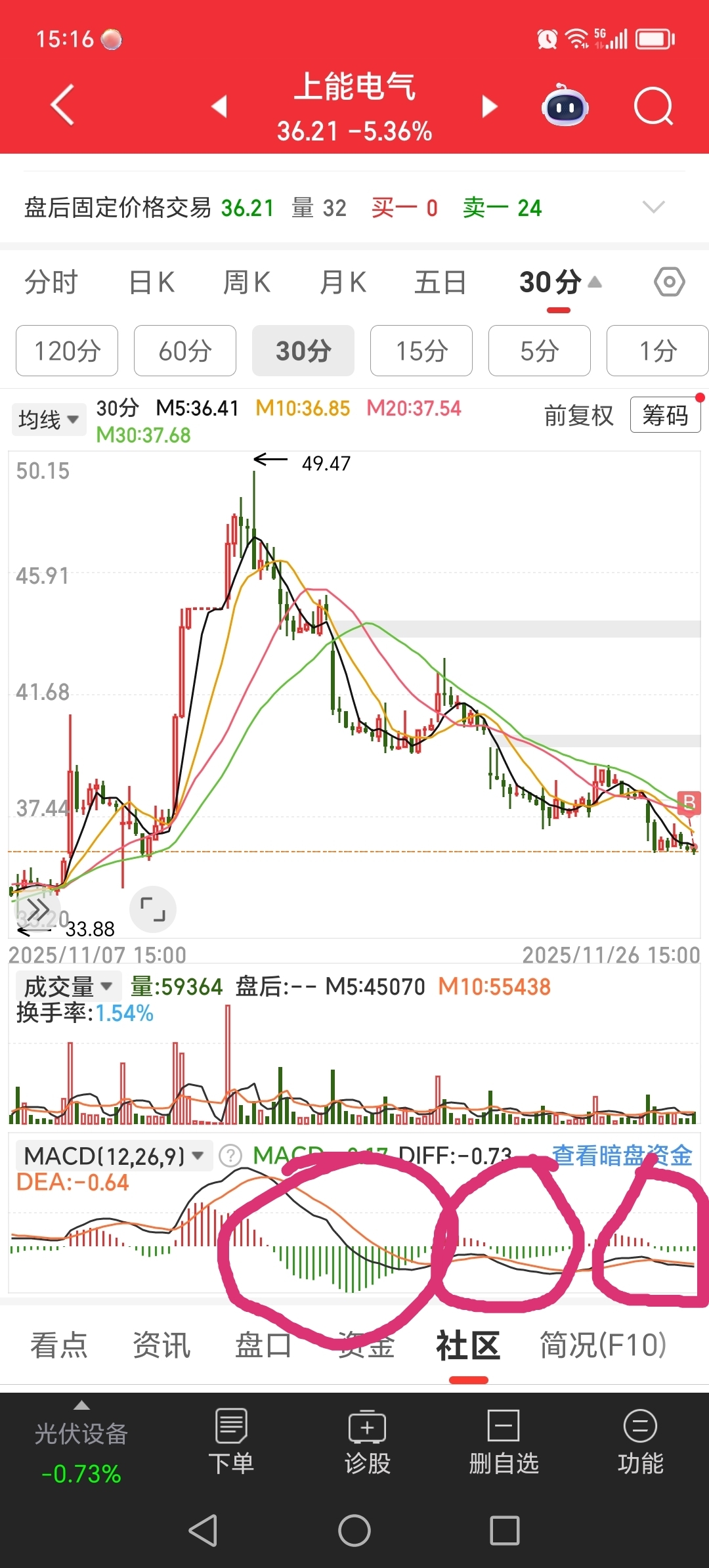 尾盘三成仓买入300827上能电气,30分钟macd双重底背离,看好明天反弹。从