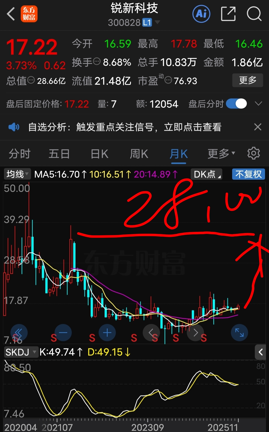 $锐新科技(SZ300828)$ 低吸关注目标价是28元