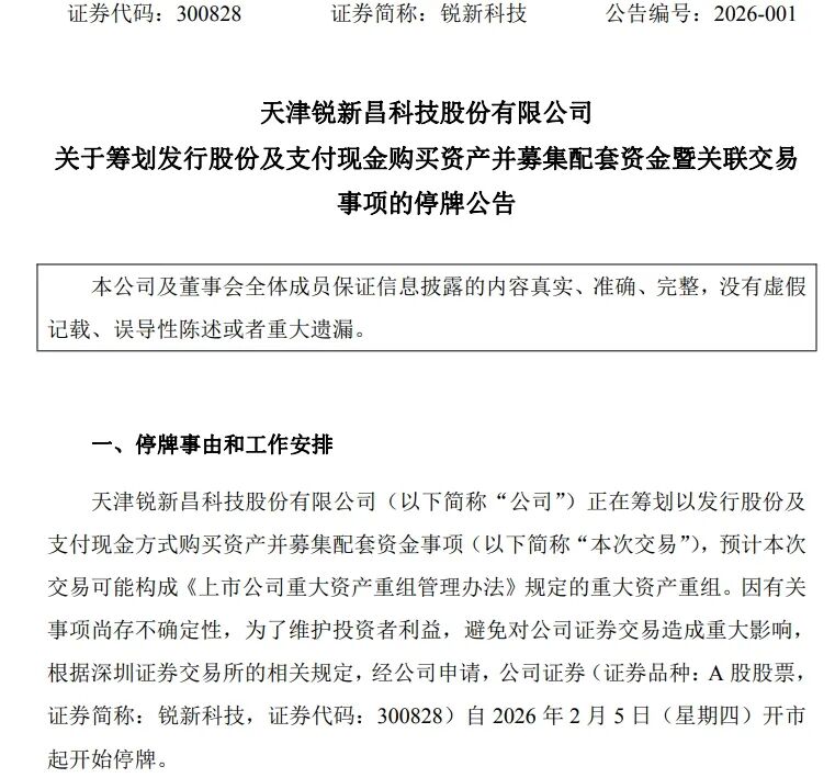 锐新科技2月4日晚间公告称,公司正在筹划以发行股份及支付现金方式购买芜湖德恒汽车装备有限公司股权并募集配套资金事项。本次交易预计构成重大资产重组。公司证券自2月5日(星期四)开市起停牌。