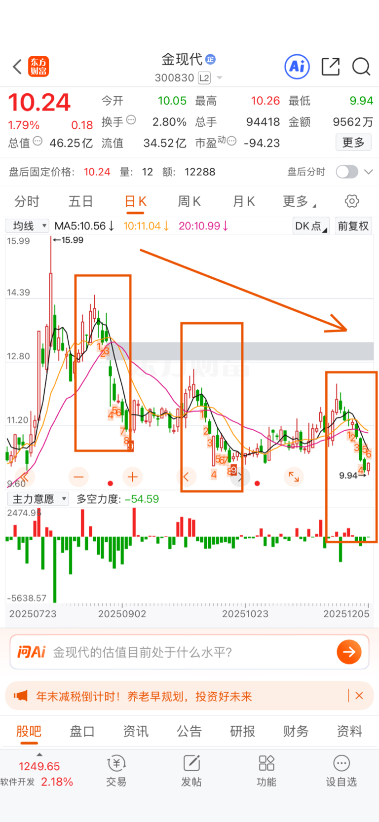 $金现代(SZ300830)$ 这不就是中继下跌的趋势吗?不知道股吧还有人在自我安慰什么?幻想什么?将近4万的散户,就没有炒股俩年半以上的股友看不出来吗?这种走势就不是趋势往上,根本和软件板块不搭,涨少跌多,宁愿买板块龙头,起码亏损加个仓还能回本,服了。