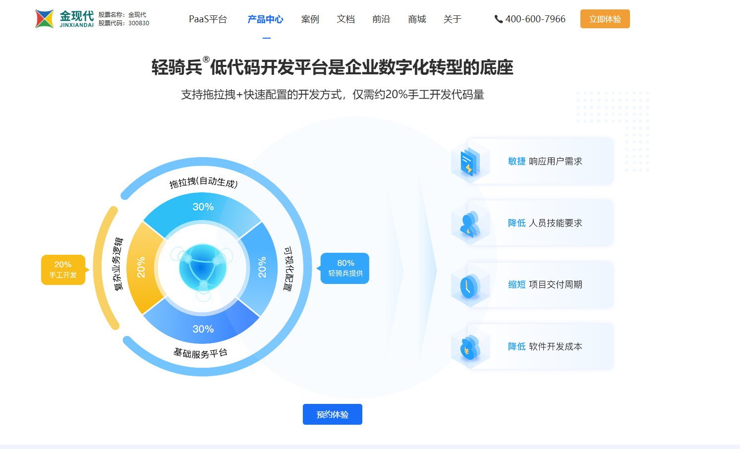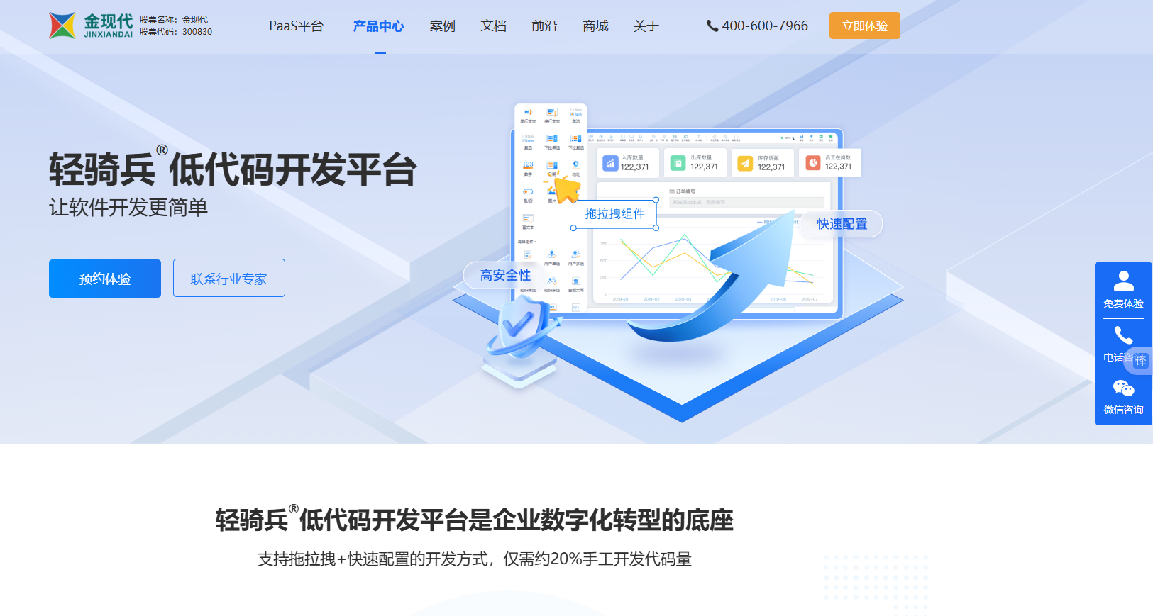 “轻骑兵低代码开发平台”是金现代信息产业股份有限公司自主研发的企业级软件开发平台。其核心是通过可视化拖拽等方式,大幅降低开发门槛与成本,快速构建高体验应用程序