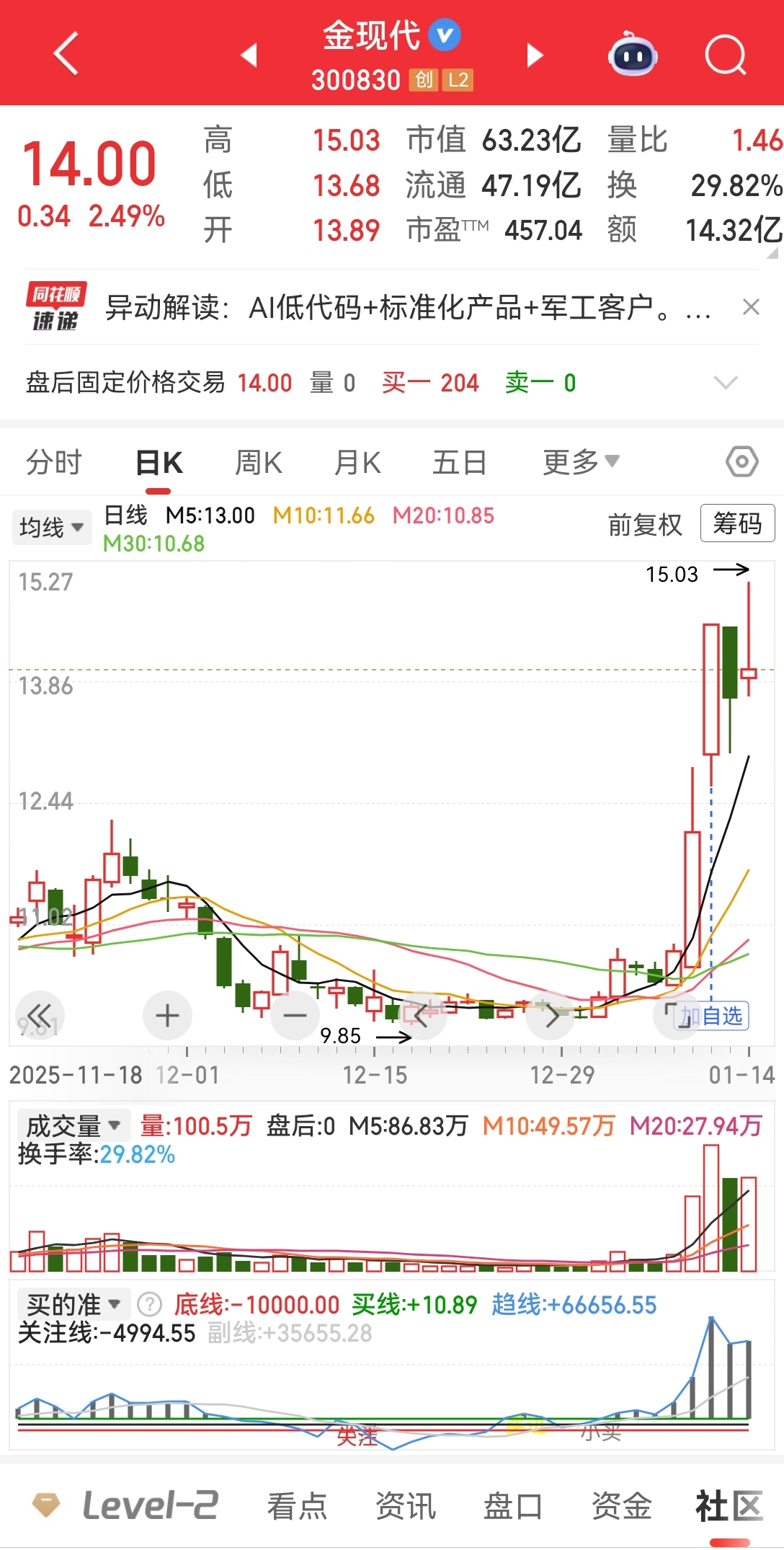 $金现代(SZ300830)$ 近两天的K线上下影和上影组合成一个十字星,结合量能来看,妥妥的洗盘