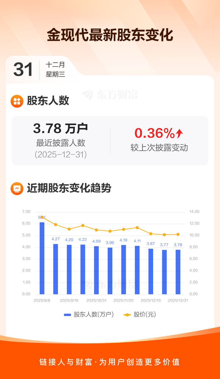 金现代最新披露数据显示,截至12月31日公司股东户数为3.78万户,较上期(2025年12月19日)增加136户,增幅为0.36%。户均持有流通股数量由上期的8949股下降至8917股,户均持股金额由上期的9.06万元增加至9.08万元。