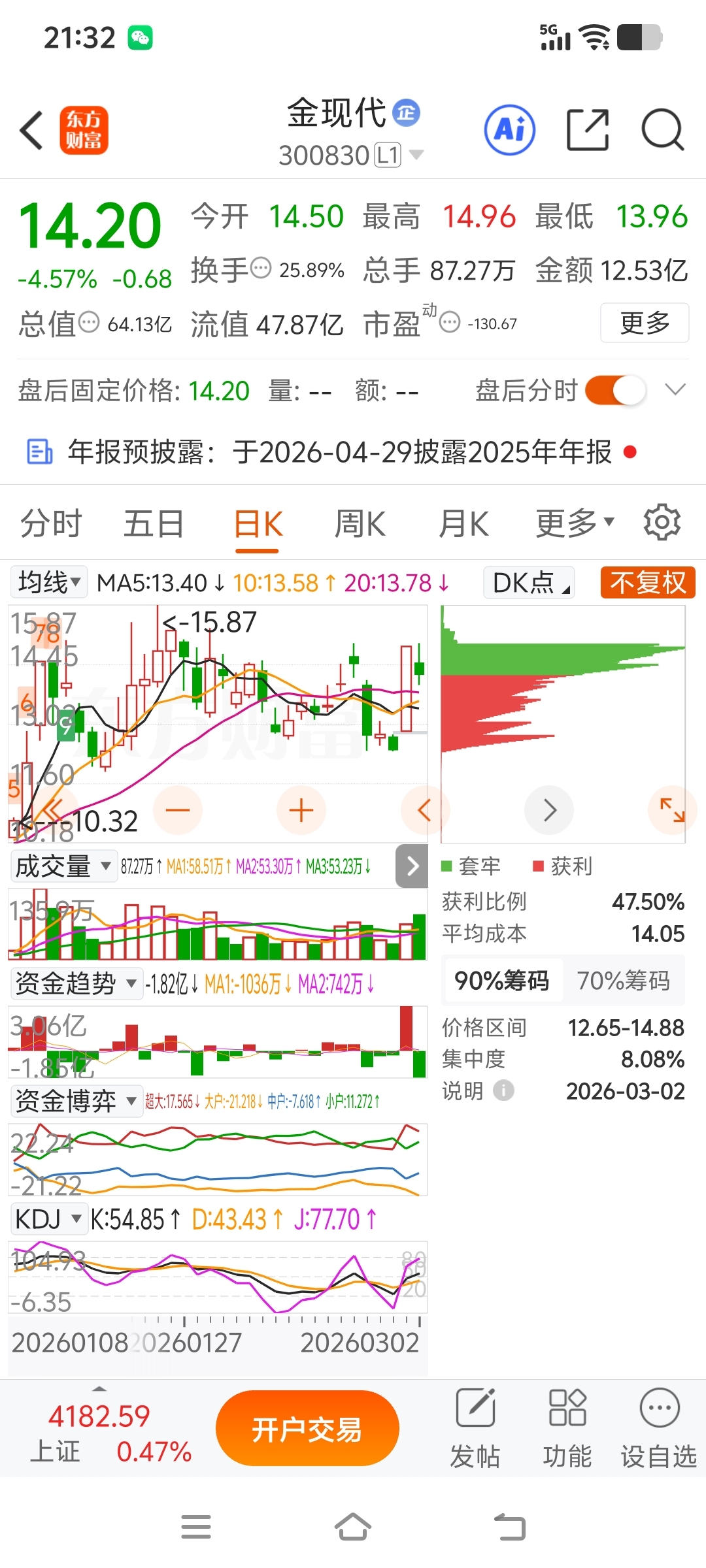 $金现代(SZ300830)$ 今天早盘11.14分在帖子上留言,13.8上下有强支撑,今天放量最低探到13.96止跌,从盘面看成交量同比放大,资金接盘实力很强,柚子大概率走了,尾盘集合竟价很有意思,断定明天拉升反包,不排除闯出新高,明天盘中见吧!