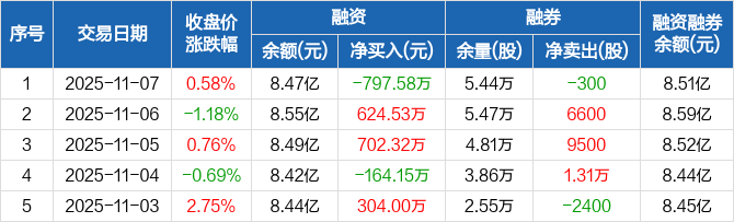 新产业:融资净偿还797.58万元,融资余额8.47亿元(11-07)