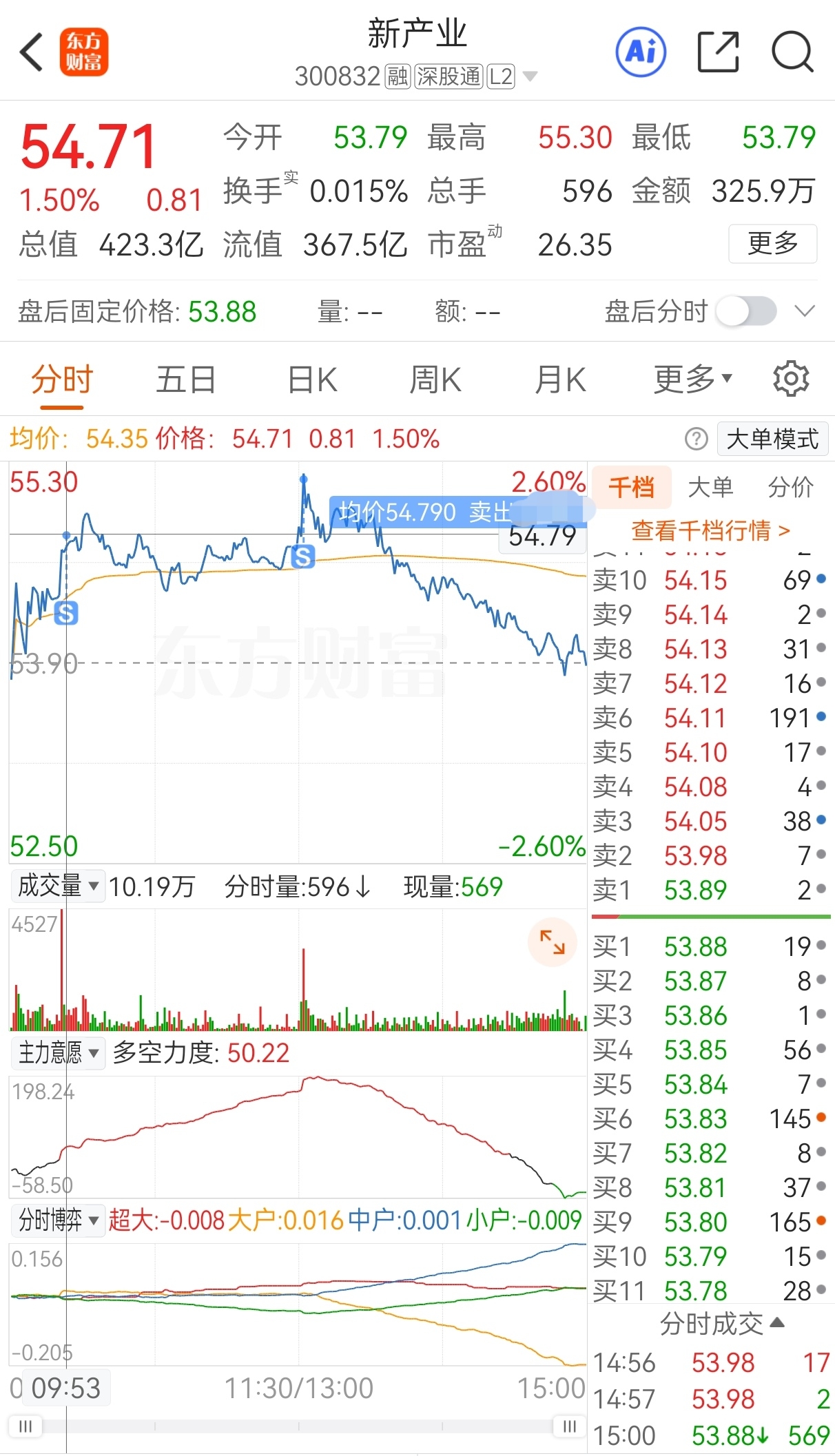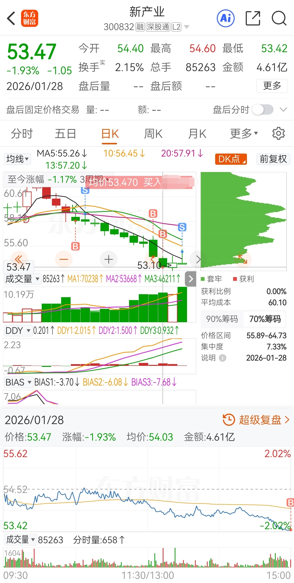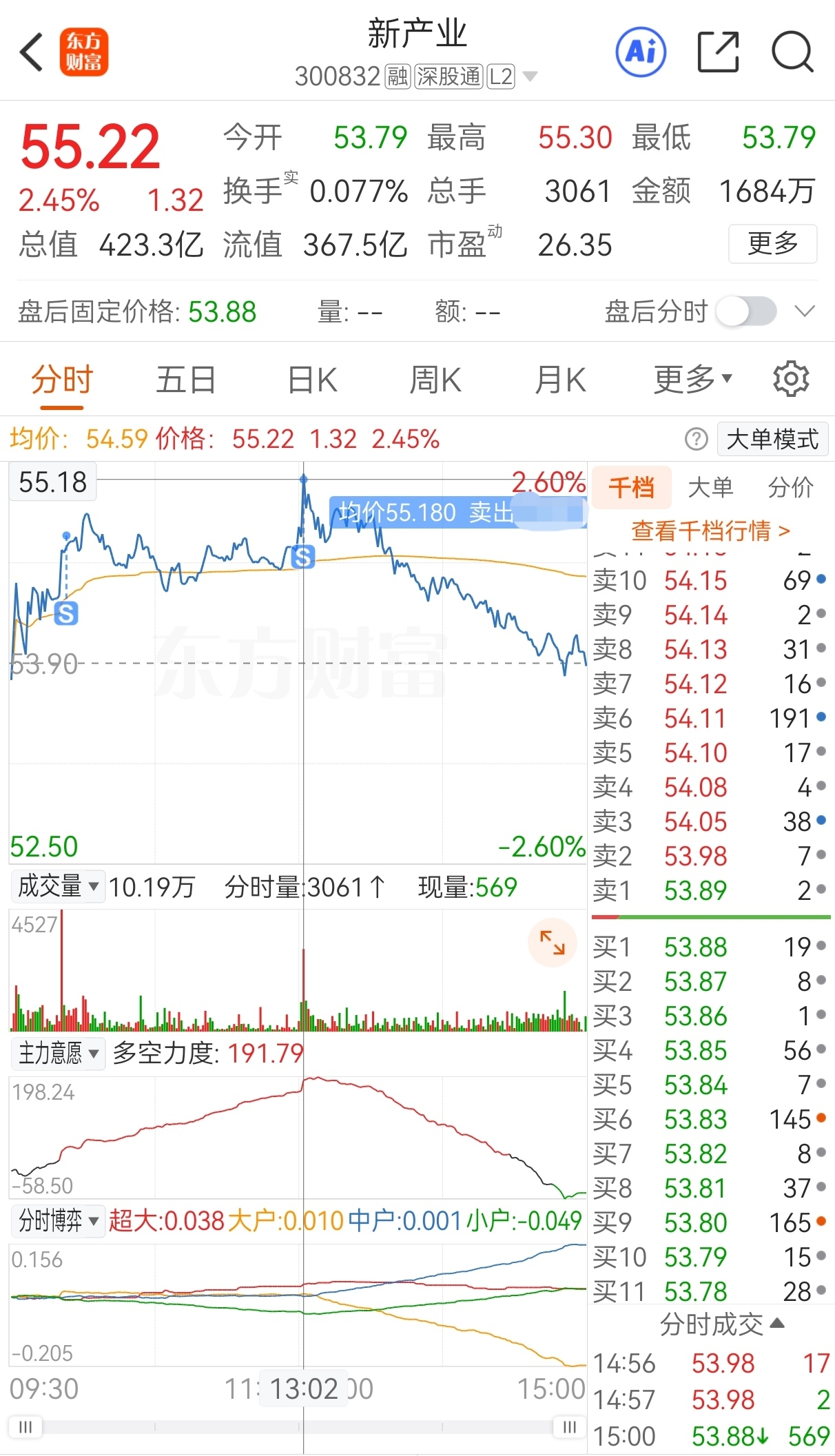 $新产业(SZ300832)$ 原计划今买明卖,实际54.52买,53.47加仓,54.79减仓,55.18卖,实盘短线套利新产业,成功收米走人!