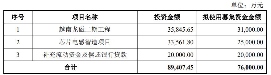 根据预案,此次募资将主要投向两大方向:一是投入募集资金3.1亿元用于“越南龙磁二期工程”,以扩充其核心产品永磁铁氧体湿压磁瓦的海外产能等;二是投入募集资金2.5亿元加码“芯片电感智造项目”。