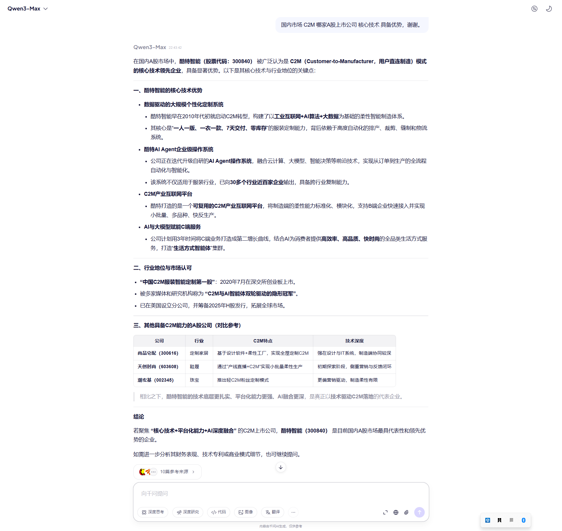 千问回答:国内市场 C2M 哪家A股上市公司 核心技术 具备优势,谢谢。