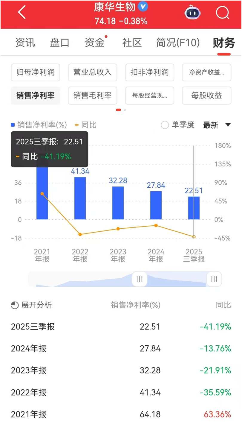 其中,净利润“腰斩”背后,是康华生物销售毛利率和销售净利率的双双下滑。财报显示,2025年三季度,公司销售毛利率为92.29%,较去年同期同比下降2.1%;销售净利率为22.51%,同比大幅减少41.19%。这些数据表明公司在成本控制和经营效率方面面临严峻挑战。