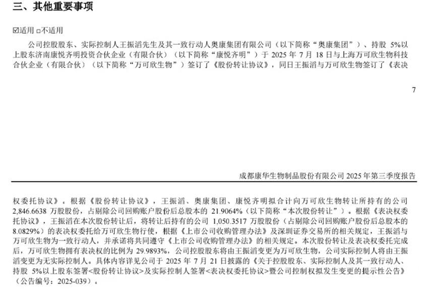 这一变动的起点是2025年7月,康华生物控股股东、实际控制人王振滔及其一致行动人奥康集团有限公司(以下简称“奥康集团”)、持股5%以上股东济南康悦齐明投资合伙企业(有限合伙)(以下简称“康悦齐明”)与上海万可欣生物科技合伙企业(有限合伙)(以下简称“万可欣生物”)签订了《股份转让协议》。