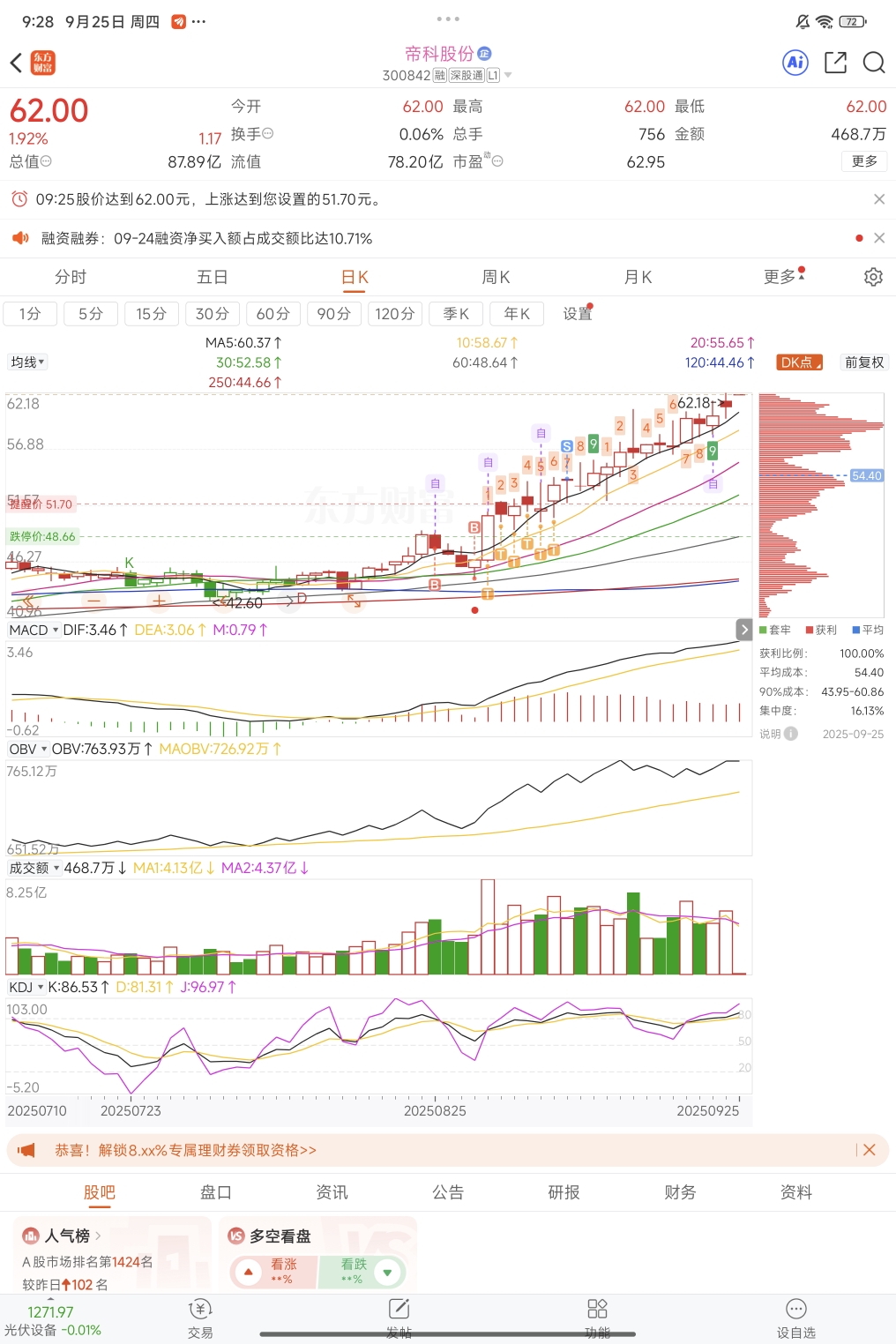$帝科股份(SZ300842)$ 你怎么还在涨!5日均线就是不破啊,牛掰,可能要加速走主升浪了