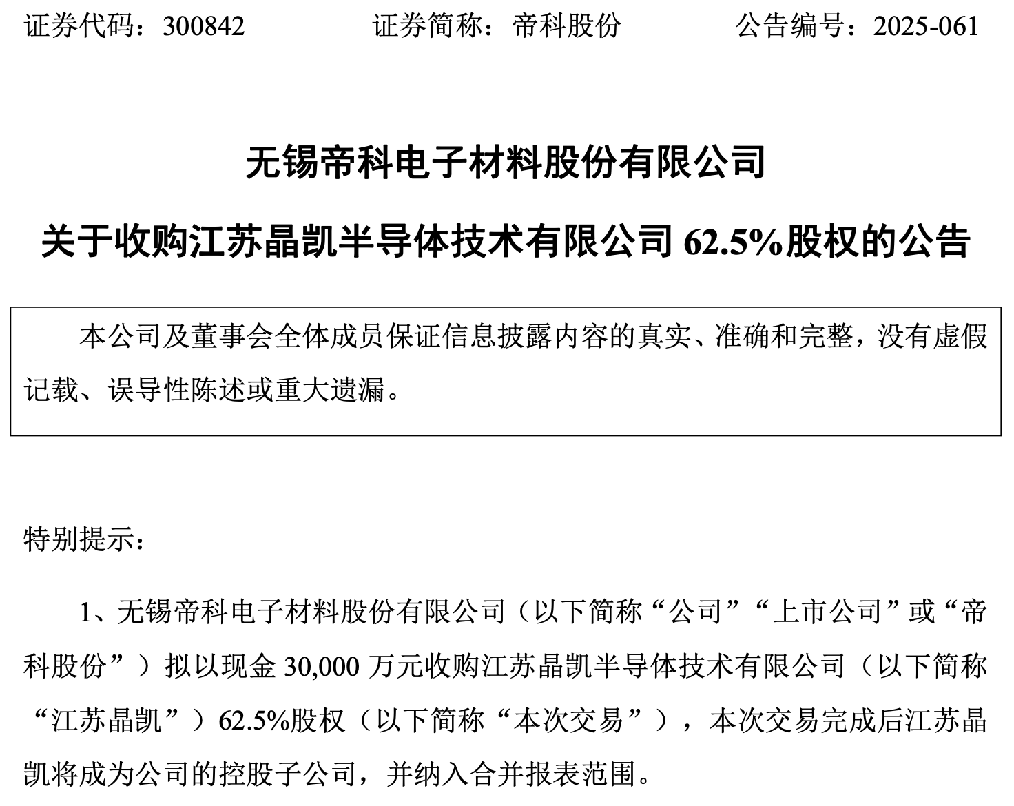 10月14日,帝科股份(300842)公告,公司拟以现金3亿元收购江苏晶凯半导体技术有限公司(简称“江苏晶凯”)62.5%股权,此次交易完成后江苏晶凯将成为公司的控股子公司,并纳入合并报表范围。