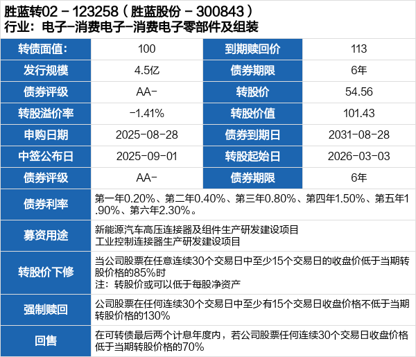 参考当前评级、规模等因子相似,正股行业相同的转债当前市场表现,胜蓝转02上市首日转股溢价率区间预计为28% ~ 35%,对应首日收盘价预计区间在129.83 ~ 136.93元。