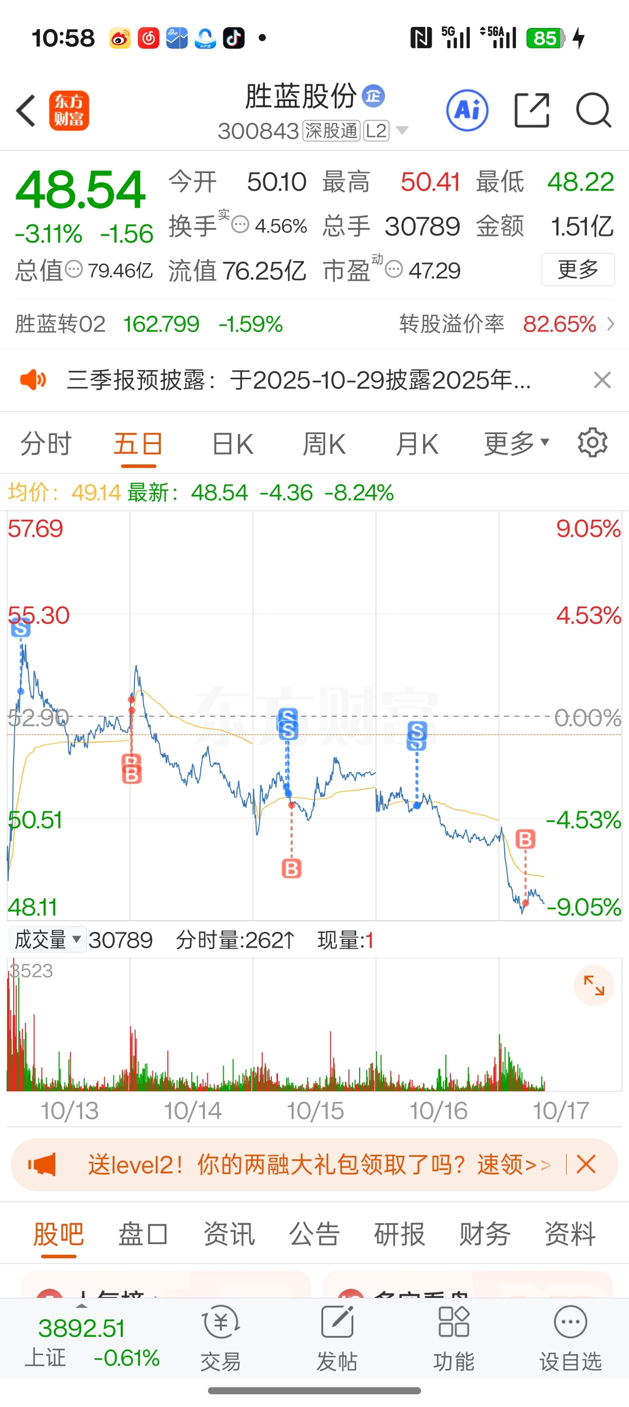 $胜蓝股份(SZ300843)$ 虽然知道三季报前大概率不会有行情了,但是没办法,亏得实在是太多了,只能跟你死磕了,希望你能给坚定持有的兄弟们来个补涨吧,起码给个反弹。