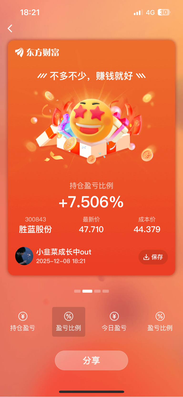 $胜蓝股份(SZ300843)$ 持股42手,总算是盈利了,想让我亏钱走不可能的事情!