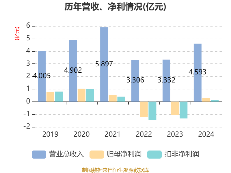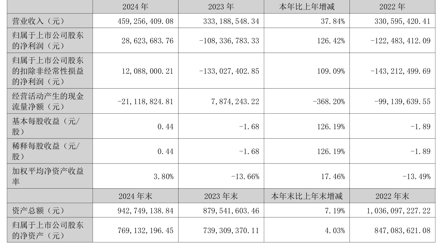 中证智能财讯山水比德(300844)4月22日披露2024年年度报告。2024年,公司实现营业总收入4.59亿元,同比增长37.84%;归母净利润2862.37万元,同比扭亏;扣非净利润1208.8万元,同比扭亏;经营活动产生的现金流量净额为-2111.88万元,上年同期为787.42万元;报告期内,山水比德基本每股收益为0.44元,加权平均净资产收益率为3.80%。公司2024年度分配预案为:拟向全体股东每10股转4股。