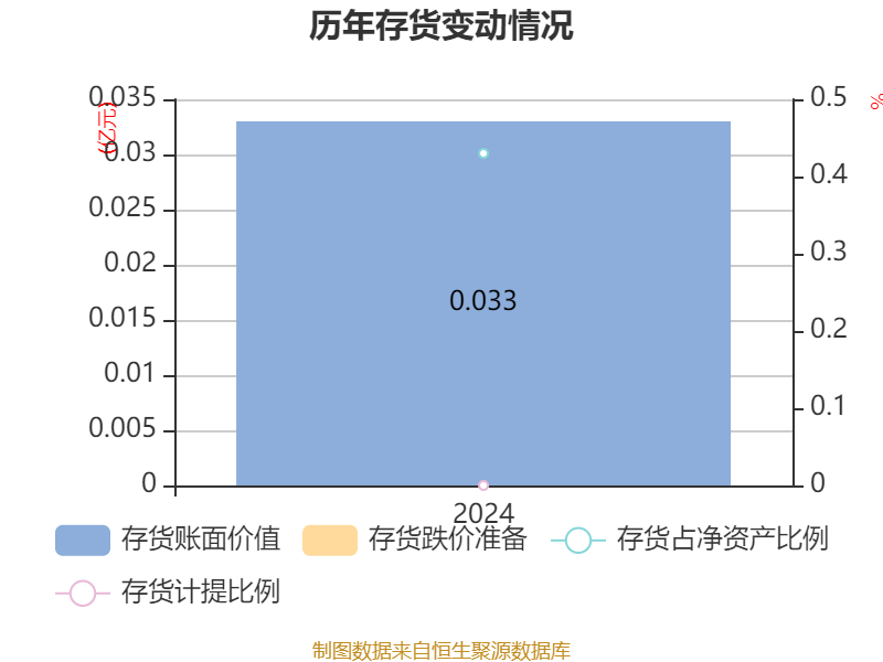 从存货变动来看,截至2024年末,公司存货账面价值为330.26万元,占净资产的0.43%,较上年末基本不变。公司本期没有计提存货跌价准备。