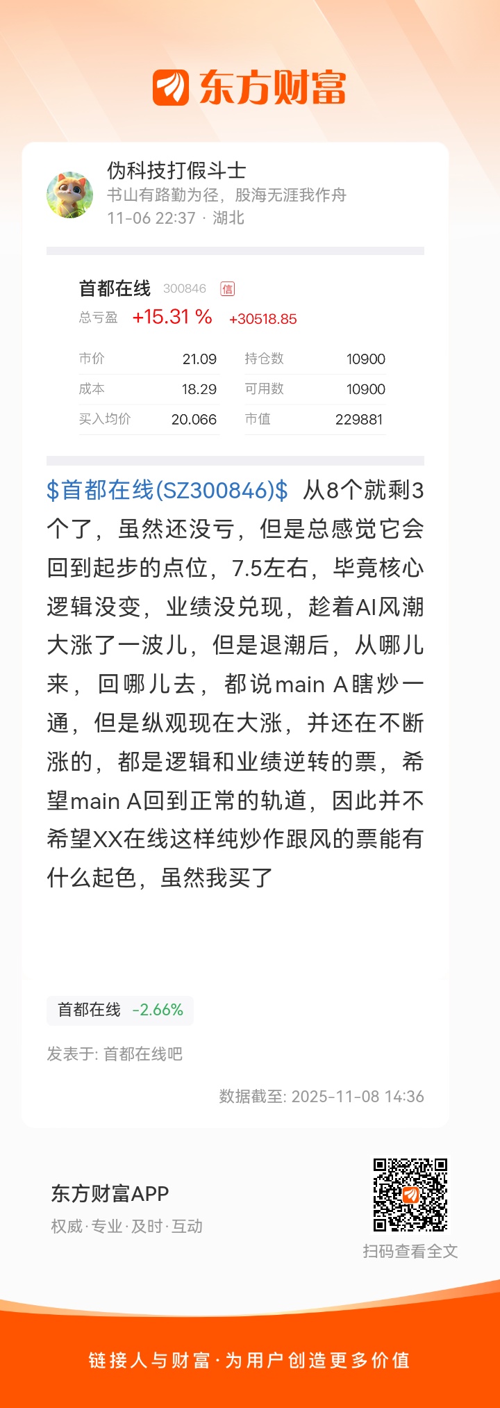 $首都在线(SZ300846)$ 从8个就剩3个了,虽然还没亏,但是总感觉它会回到起步的点位,7.5左右,毕竟核心逻辑没变,业绩没兑现,趁着AI风潮大涨了一波儿,但是退潮后,从哪儿来,回哪儿去,都说main A瞎炒一通,但是纵观现在大涨,并还在不断涨的,都是逻辑和业绩逆转的票,希望main A回到正常的轨道,因此并不希望XX在线这样纯炒作跟风的票能有什么起色,虽然我买了