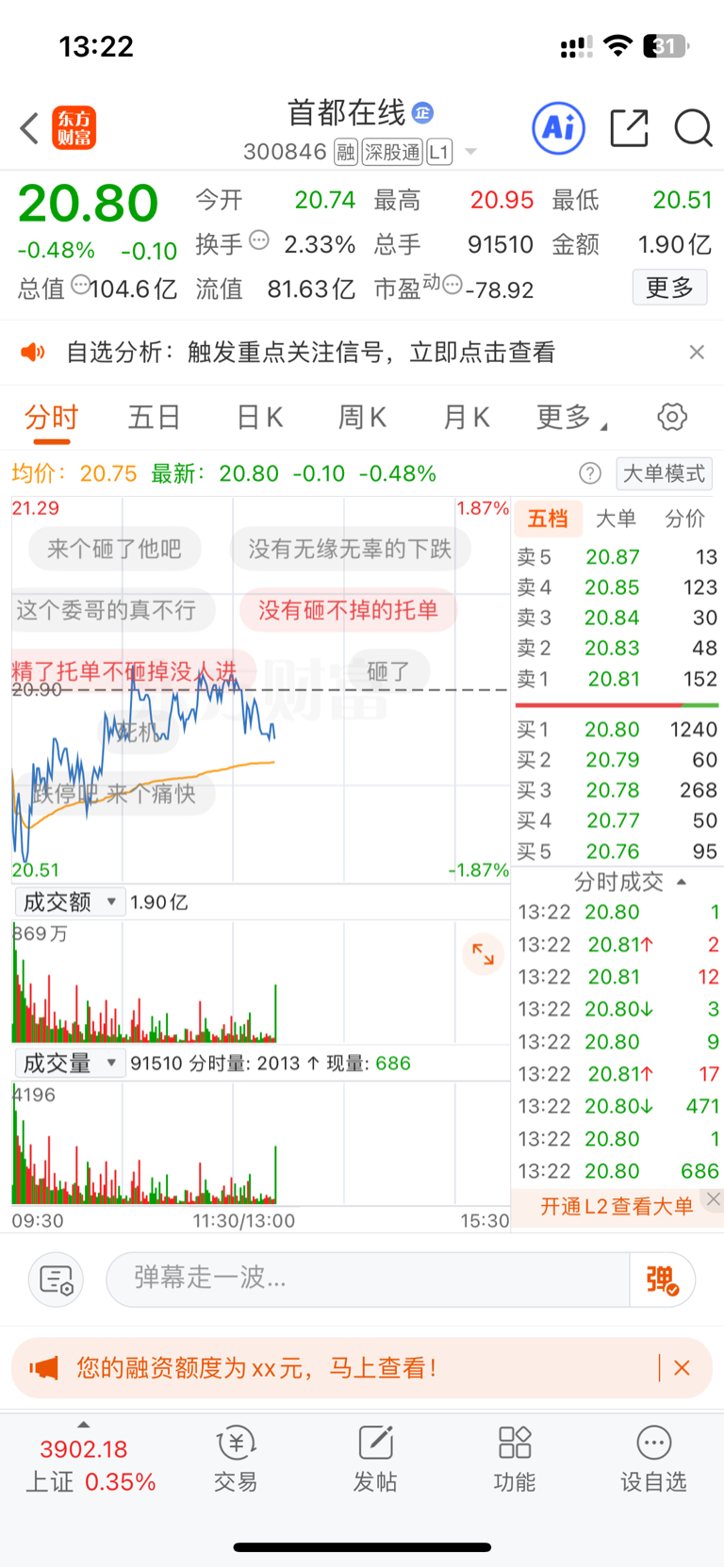 $首都在线(SZ300846)$ 这个股票满眼看去全是散户套牢盘,在说话,哎还有的跌了