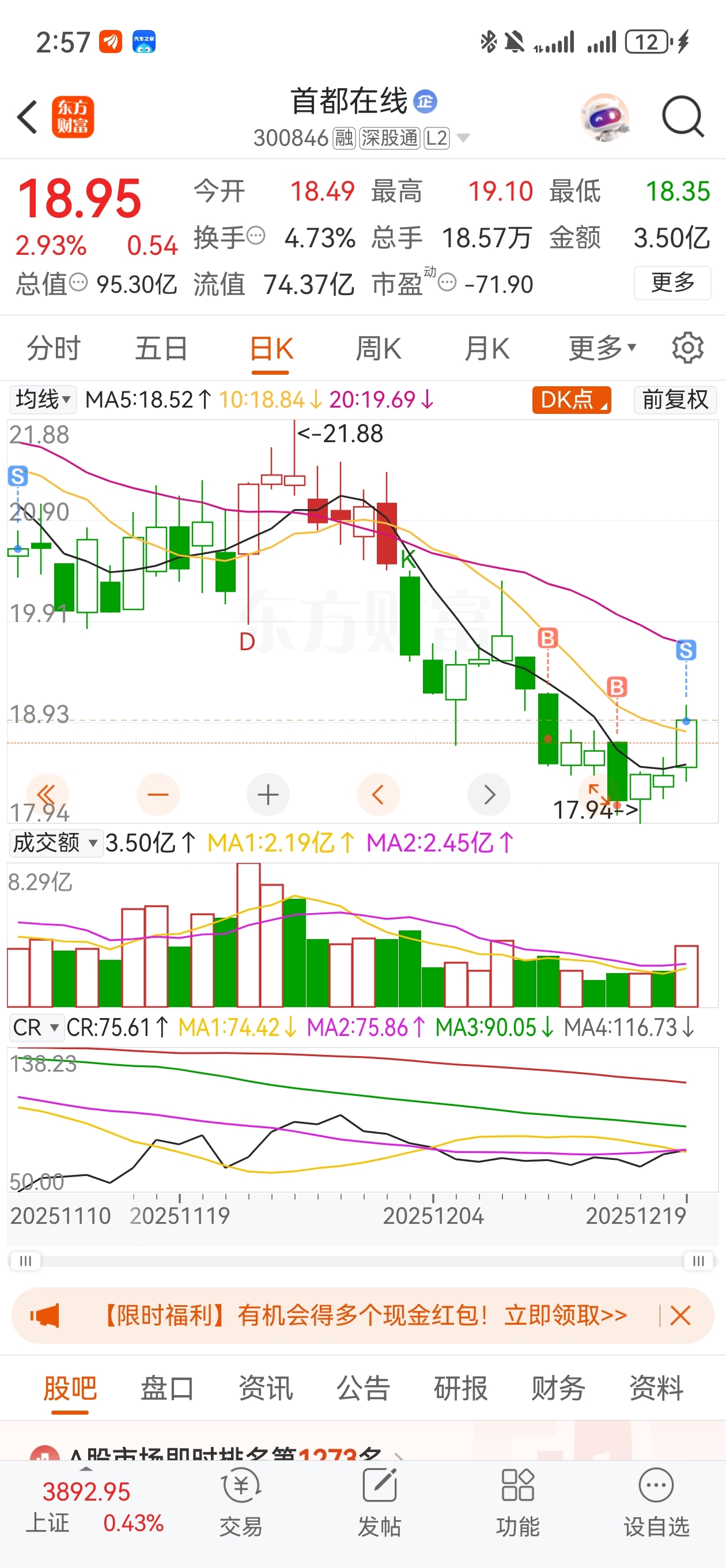 $首都在线(SZ300846)$ 卖了半仓下周一跌了再加回来