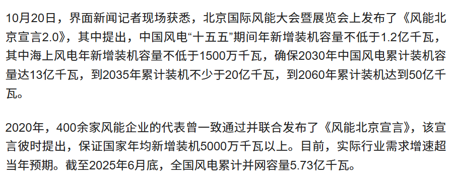 另:十四五的风电装机容量年均新增是9000多万千瓦,十五五提出新增1.2亿千瓦。