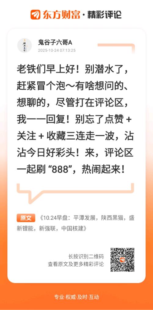 //@鬼谷子六哥A :老铁们早上好!别潜水了,赶紧冒个泡~有啥想问的、想聊的,尽管打在评论区,我一一回复!别忘了点赞 + 关注 + 收藏三连走一波,沾沾今日好彩头!来,评论区一起刷 “888”,热闹起来!