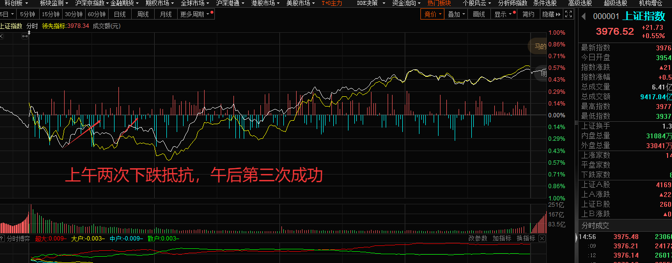 今天指数先抑后扬,早上先是一顿下冲,但是细心的朋友可能发现早上两次下跌抵抗,说明聪明的Z金已经预判到今天的剧本,咱们操作就要快速发掘聪明Z金的意图,跟随,午后果不其然把指数拉红了,下午稳定向上,修复了情绪,指数有重回4000的预期了。沪深两市成交额2.11万亿,较上一个交易日缩量2107亿,因为是缩量,所以这地方从大角度来说仍然是震荡,节奏上以低吸为主,大家啊跟进老k,不要踩错节奏。