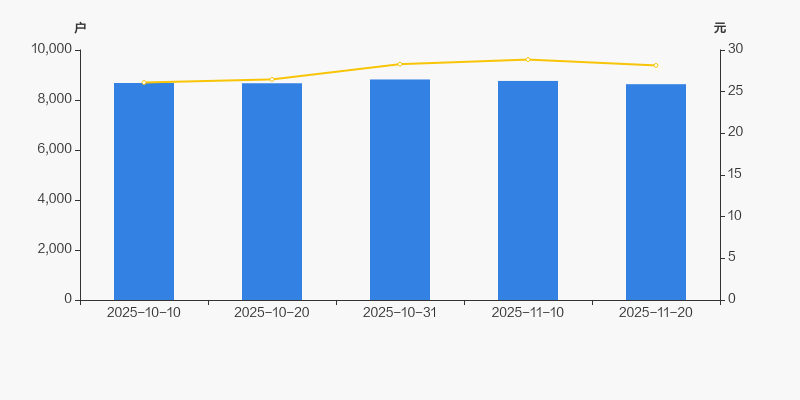 截至2025年11月20日,公司最新总股本为8693.34万股,其中流通股本为5411万股。户均持有流通股数量由上期的6176股上升至6269股,户均流通市值17.65万元。