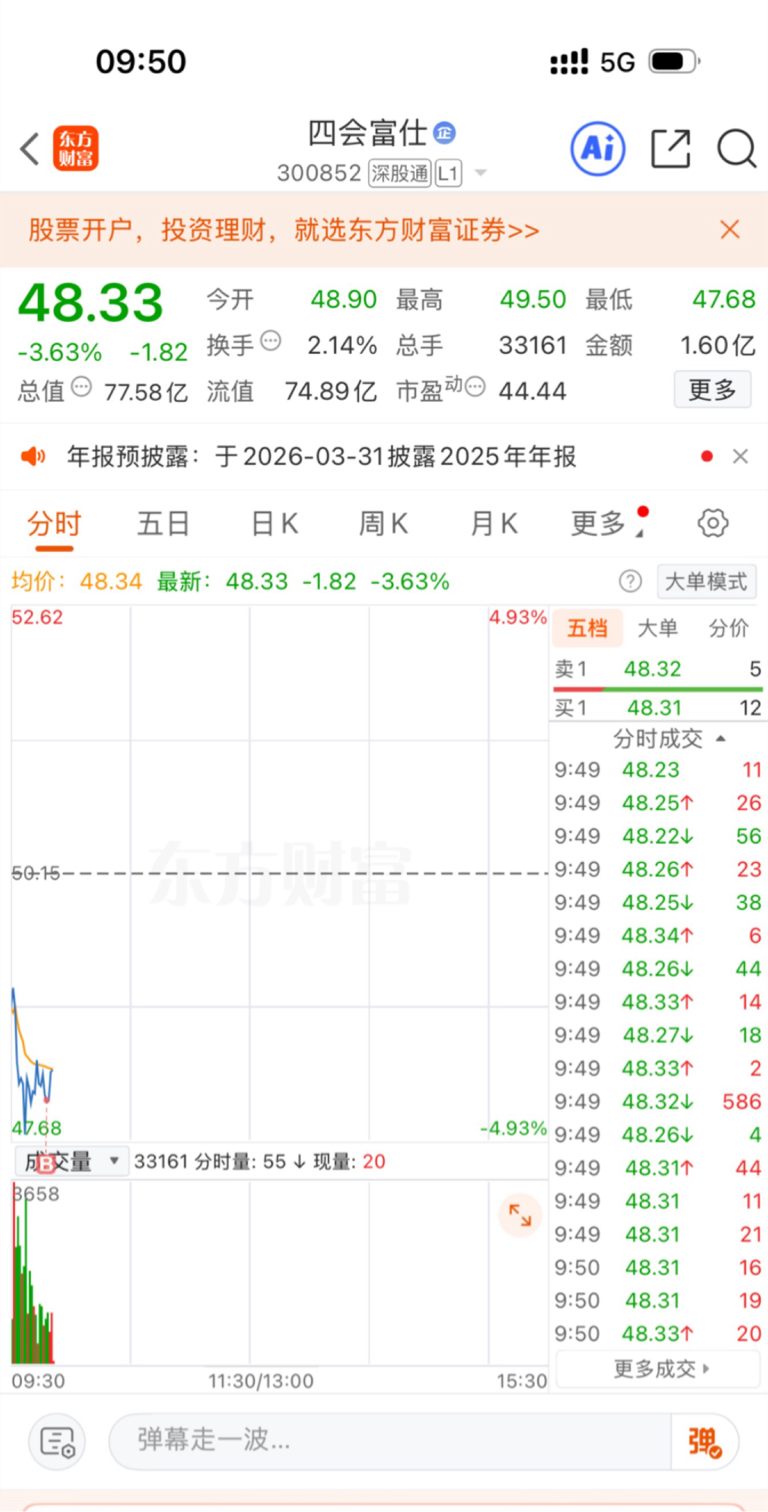 48.03选择水下博弈$四会富仕(SZ300852)$ #强势机会# #实盘记录# #投资干货# #投资随笔#