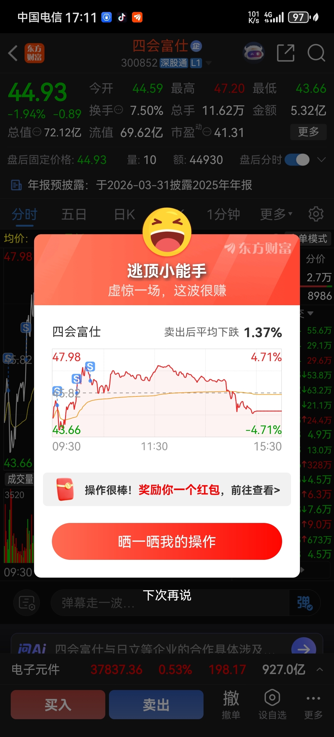 $四会富仕(SZ300852)$ 割肉要快