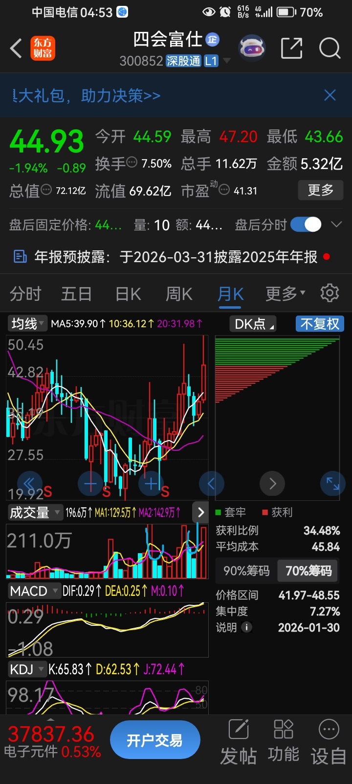 该股月线底部三次放量阳线,所谓三根立柱桩已经建立好了。业绩尚可,随着800G光模