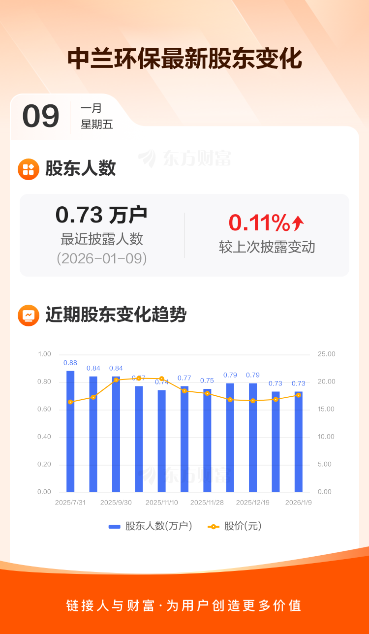 中兰环保最新披露数据显示,截至1月9日公司股东户数为7271户,较上期(2025年12月31日)增加8户,增幅为0.11%。户均持有流通股数量为1.12万股,与上期基本持平,户均持股金额由上期的18.86万元增加至19.71万元。
