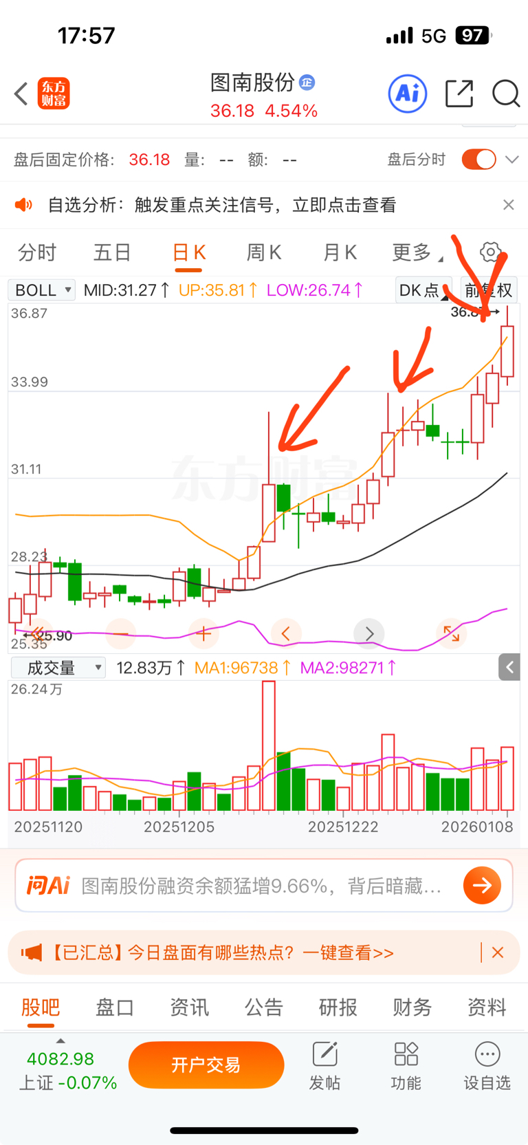 $图南股份(SZ300855)$ 这股每次拉阳线收盘价在boll上轨上方,都要开始调整好几天,今天T出半仓后面接回来。主力明天能不能来点不一样的,直接让我卖飞,见识一下实力