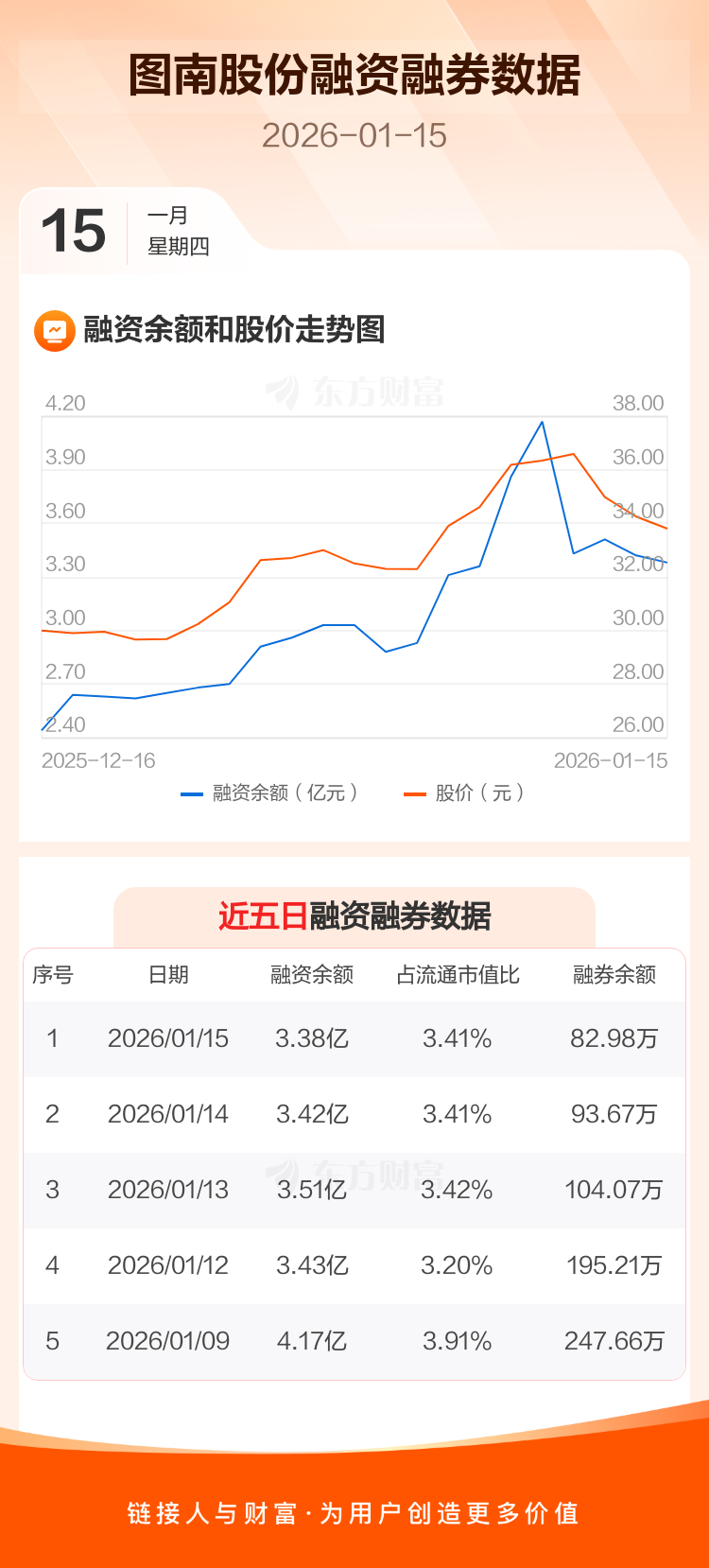 交易所最新数据显示,图南股份于2026年1月15日获融资买入1171.94万元,融资偿还1620.90万元,当日融资净偿还448.96万元。目前,该股融资余额3.38亿,占流通市值比例为3.41%。