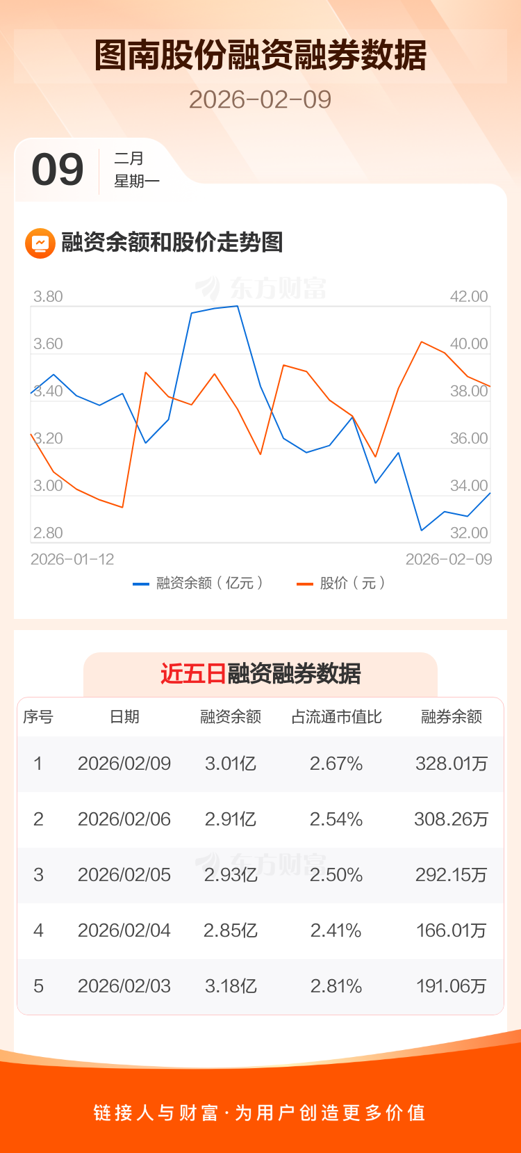 交易所最新数据显示,图南股份于2026年2月9日获融资买入2998.11万元,融资偿还1934.27万元,当日融资净买入1063.84万元。目前,该股融资余额3.01亿,占流通市值比例为2.67%。