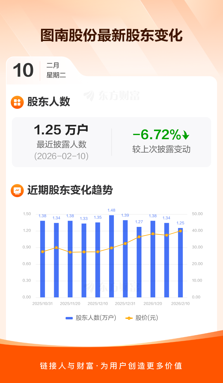图南股份:截至2月10日最新股东户数1.25万户,较上期减少6.72%