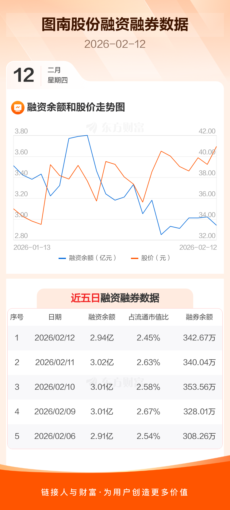 交易所最新数据显示,图南股份于2026年2月12日获融资买入2787.79万元,融资偿还3591.44万元,当日融资净偿还803.64万元。目前,该股融资余额2.94亿,占流通市值比例为2.45%。