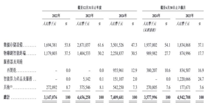 2022年、2023年、2024年和2025年上半年(以下简称报告期内),协创数据主要经营四大主要业务线,即数据存储设备、物联网智能终端、服务器及周边再制造、智能算力产品及服务。今年公司开始大规模投入AI基础设施建设、实现收入大幅增长并拓展算力服务行业。