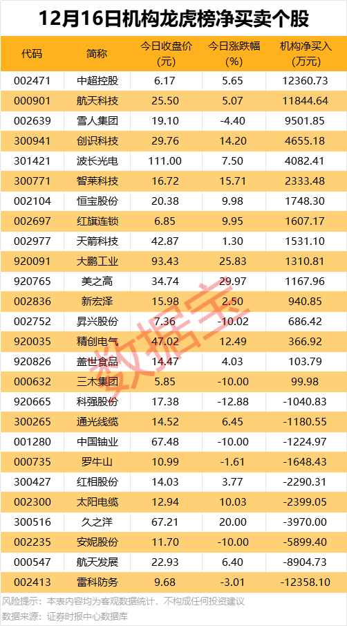 今日龙虎榜中,净买入个股有16只,净卖出的个股为10只。中超控股、航天科技2股净买入金额均超1亿元,雪人集团、创识科技、波长光电,机构净买入金额均超4000万元。