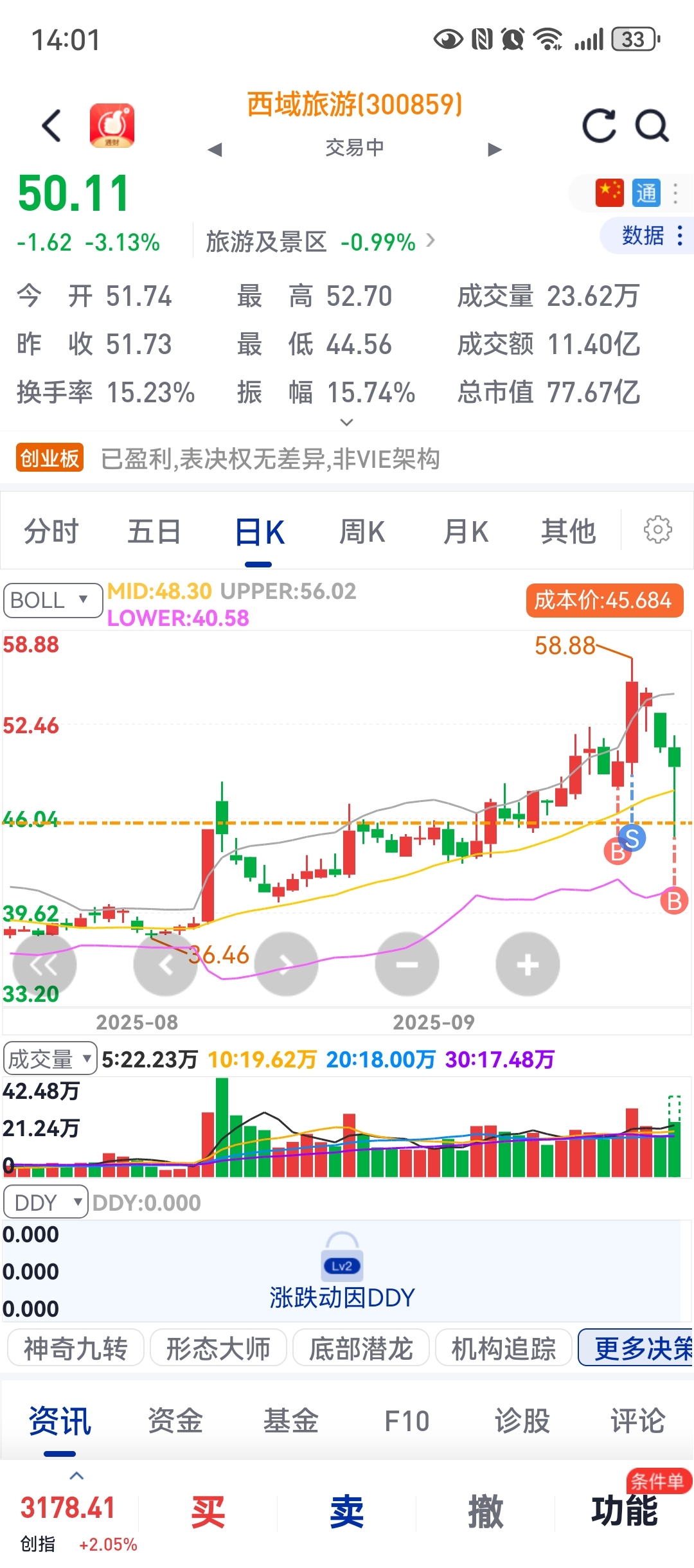 $西域旅游(SZ300859)$ 58.5卖,45又接回来。你随便洗,我主打跟随