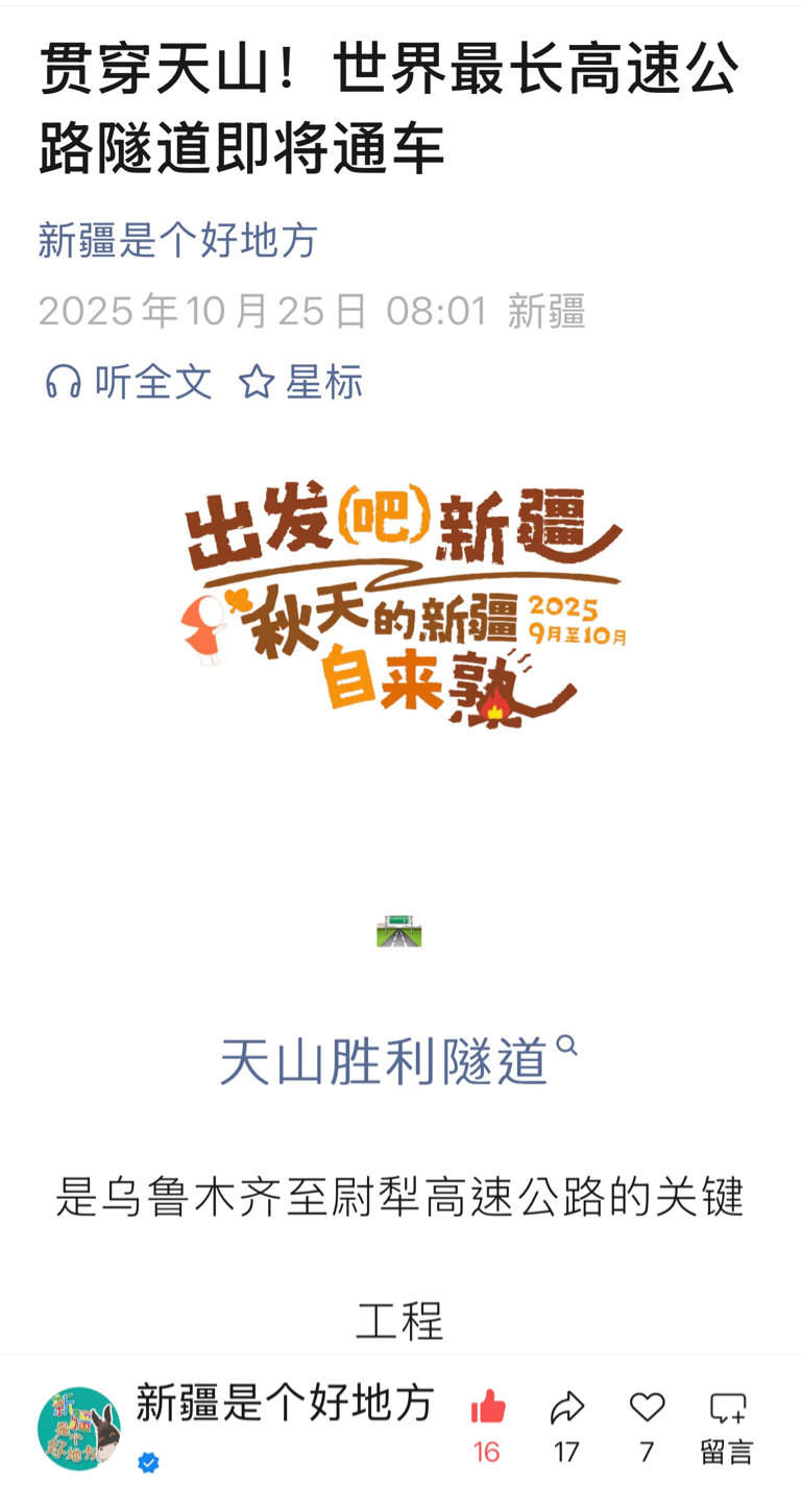 $西域旅游(SZ300859)$ 全球最长高速公路隧道、新疆天山胜利隧道年底通车,南北疆互联提速,乌鲁木齐至巴州车程从8小时缩短至3小时,天山屏障打破后,新疆将构建3小时旅游圈。