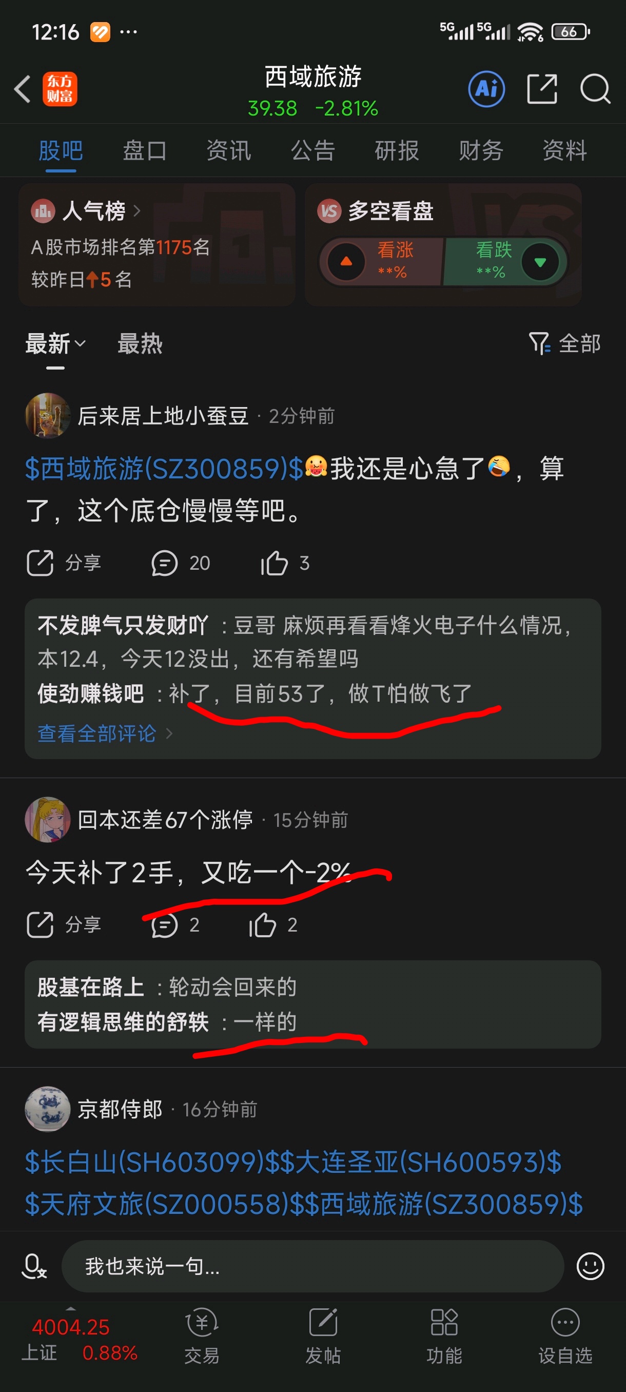 $西域旅游(SZ300859)$ 我早就说过,下跌途中,散户才会买入或者补仓,你看股吧就知道咋回事了,散户通常都是越跌越买,主力就是抓这个机会跑,通常上涨是因为散户买的不多,下跌散户买入感觉安全,所以上涨是吸引,下跌是出货