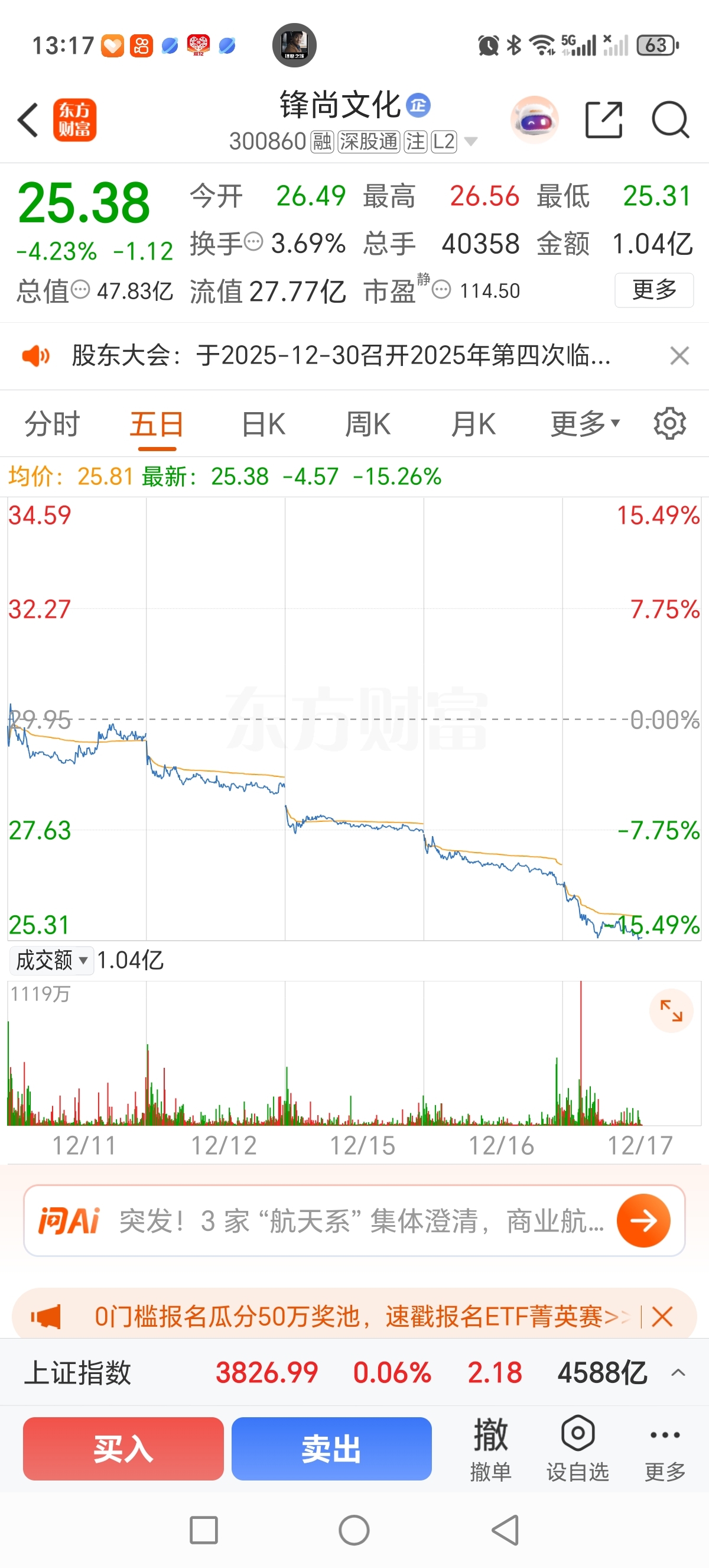 $锋尚文化(SZ300860)$ 5天跌了16个点